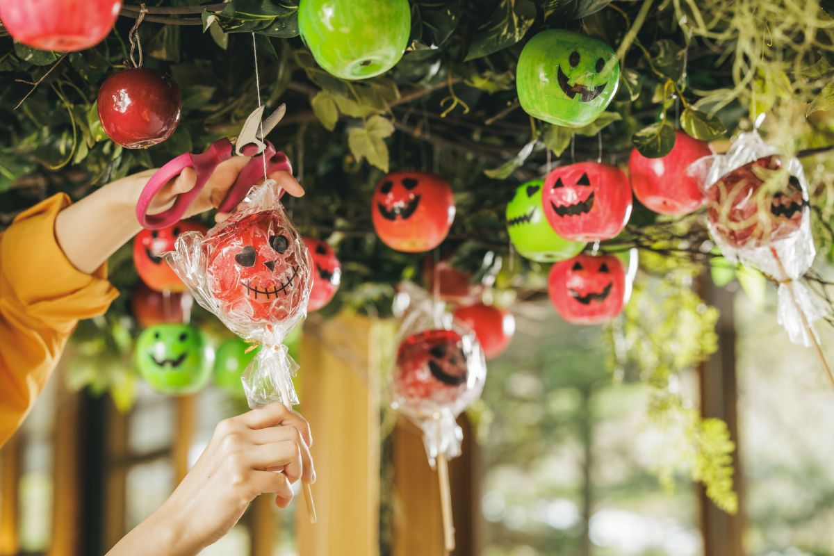また17~21時にはTAMARIBAの一角に、りんごジャック・オー・ランタン飴が吊るされた木の装飾が登場!まるでりんごを収穫するかのように、自分でりんごジャック・オー・ランタン飴の上部をハサミでカットして、1個650円で購入ができます。収穫したりんご飴を一口サイズにカットできるグッズもレンタルしているので、仲間とシェアすることもできます。