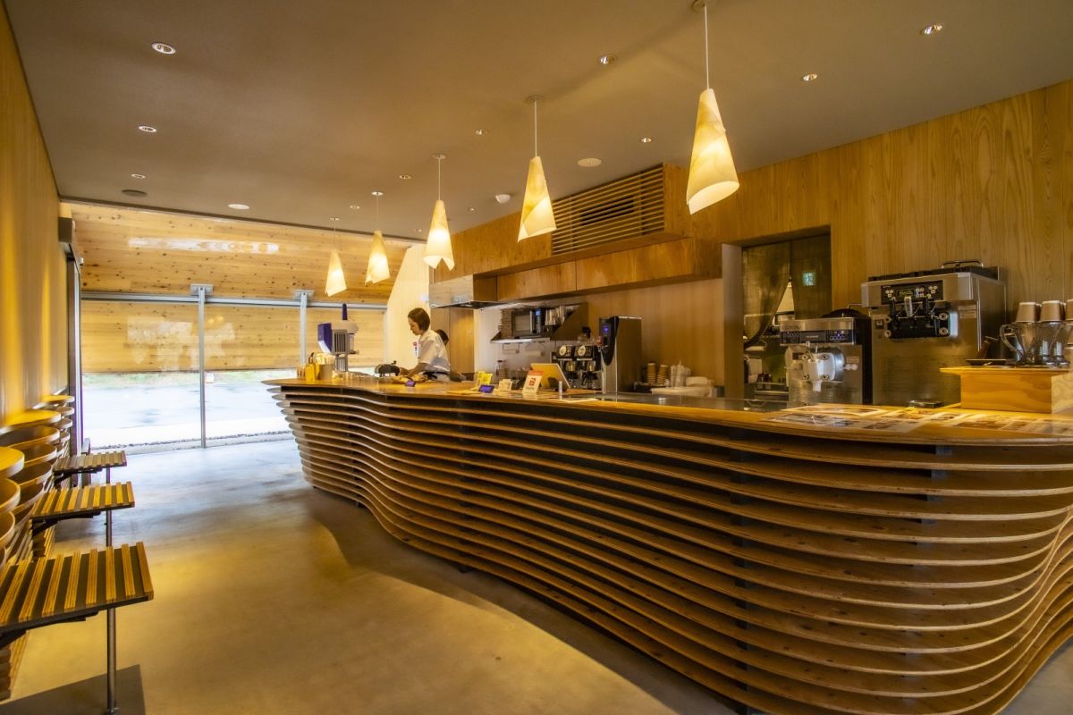店内は、砂丘をモチーフに曲線的にデザインされており、外観同様、店内も鳥取県産の木材を使用。柔らかな照明の光が温かな雰囲気を演出しています。1階、2階には食事ができるテーブル席があり、3階のテラスでは鳥取砂丘と日本海を眺めることができます。