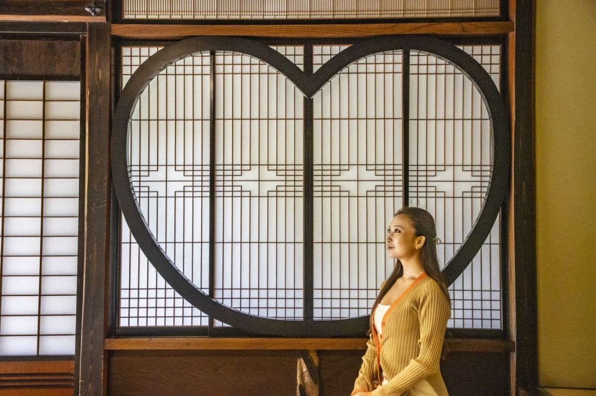 もうひとつの注目スポットが、江戸座敷にあるハート型の障子。実はこちら、猪の目という文様で、魔除けや、福を招くという意味が込められているそう。伝統的な日本建築であるにもかかわらず、今風のかわいい写真が撮れちゃうのがポイントです。