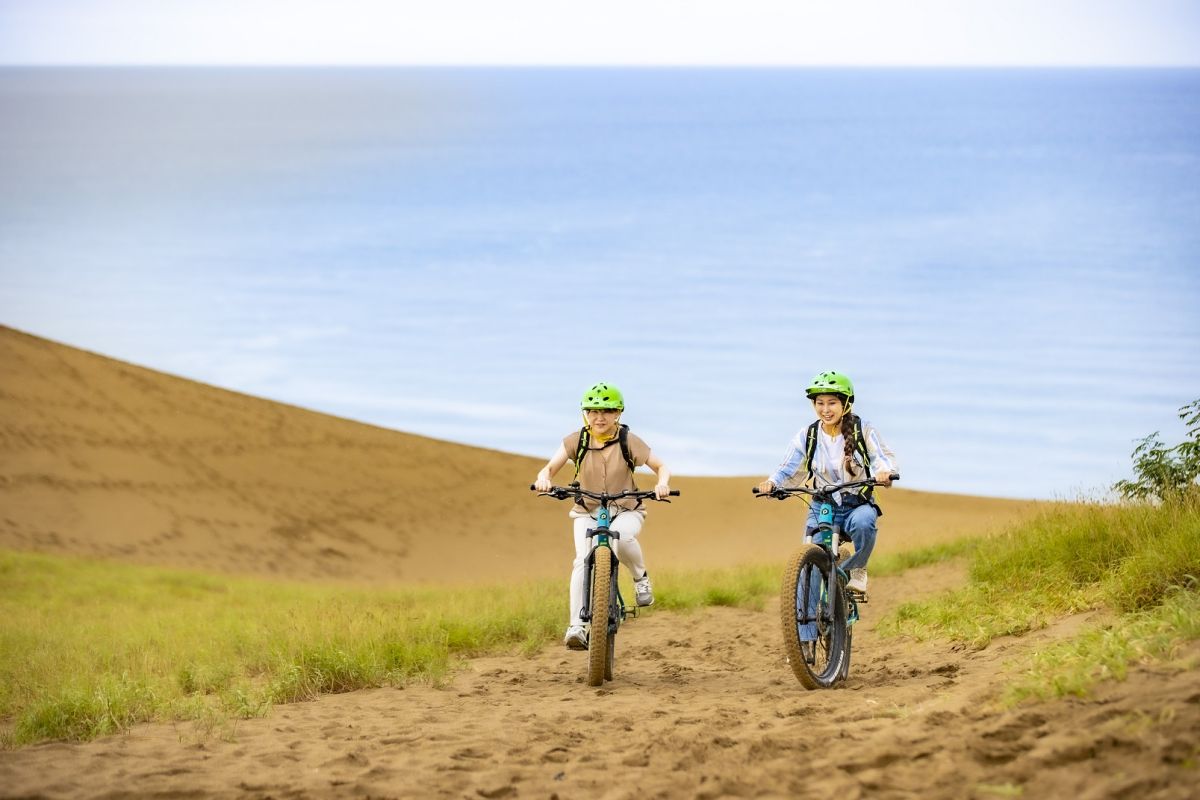 鳥取砂丘でぜひ体験してほしいアクティビティがファットバイクです。鳥取砂丘の砂地やビーチ、周辺の山道などさまざまなフィールドでサイクリングが楽しめます。ファットバイクは、一般的なマウンテンバイクよりも2倍ほど太いタイヤなので安定感は抜群!砂地や険しい道でもグイグイと前に進めますよ。インストラクターがレクチャーしてくれるので、初めての人でも安心して体験できます。
