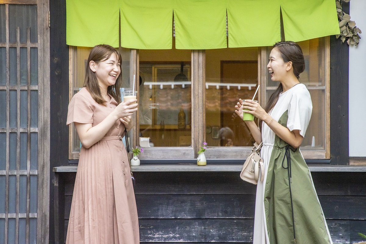 餅しゃぶのあとは街並み散策へ。散策のお供に「くだものや」のキュートなドリンクをどうぞ。「くだものや」と手書きされた看板が目印です。旬の鳥取県産の果実を使ったスムージーがいただけます。「梨グリーン」850円は、琴浦町産の和梨「寿新水」と地元産の小松菜、豆乳を使ったグリーンスムージーです。小松菜入りでも苦味がなく豆乳のまろやかさが加わることで、飲みやすい優しい味に仕上げています。ほかにも、早生種のりんご「つがる」と豆乳を合わせたシンプルな「りんご」800円など、あっという間に飲み干してしまうほど美味♪