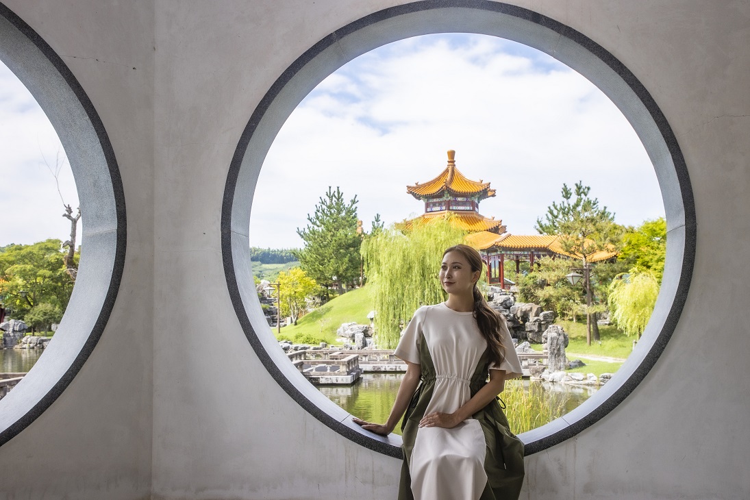「中国庭園 燕趙園」には、たくさんのフォトスポットがありますが、特に人気のスポットが、丸い窓から荷風榭、華夏堂、一覧亭の3つの建物を望める「第10景 三景軒」。SNS映えする写真が撮れると多くの人がここで撮影しています。