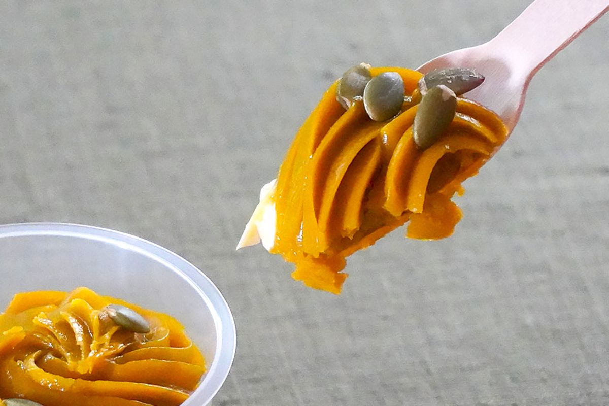 カボチャを皮付きの状態でペーストすることで、甘みだけでなくカボチャ本来の風味をより濃厚に引き出したとか。カボチャの状態に合わせて使用する皮の割合を調節し、きれいな色にしているそうです。