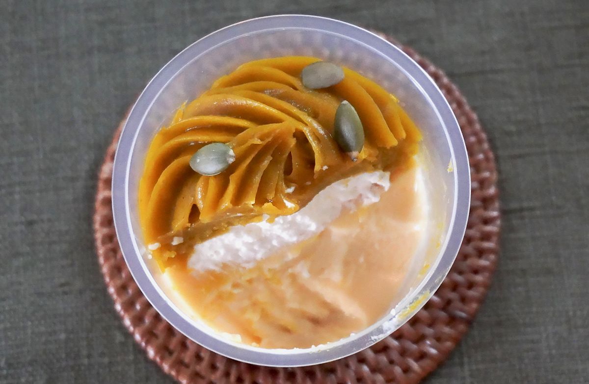 カップの蓋をあけると、きれいに絞り出されたイエローのクリームがお目見え。上にのっているカボチャの種が、なんだかかわいいですね。