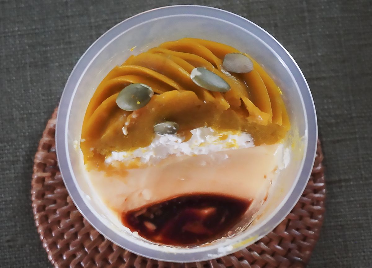 カップの外側からはわかりませんでしたが、パンプキンクリームの下には、生クリームがひそんでいて、その周りをプリンがぐるりと固めています。 この生クリームとパンプキンクリームを一緒に食べると、ねっとり濃厚なパンプキンクリームの味わいが、ふんわり軽やかに変わります。