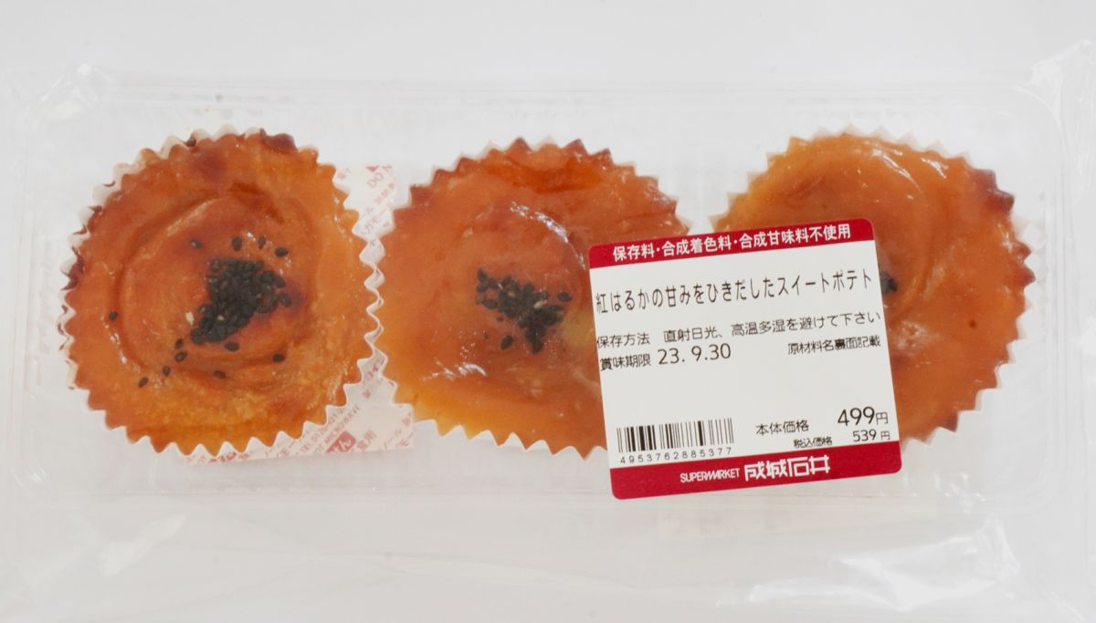 プラスチックトレーの上に、直径7cm、高さ2cmほどのスイートポテトが3個並んで入っています。シールをペタンと貼っただけのパッケージは、CO2削減など環境に配慮したものなんだとか。この飾り気の無さが、逆に商品へのこだわりと品質に対する自信を感じさせます。