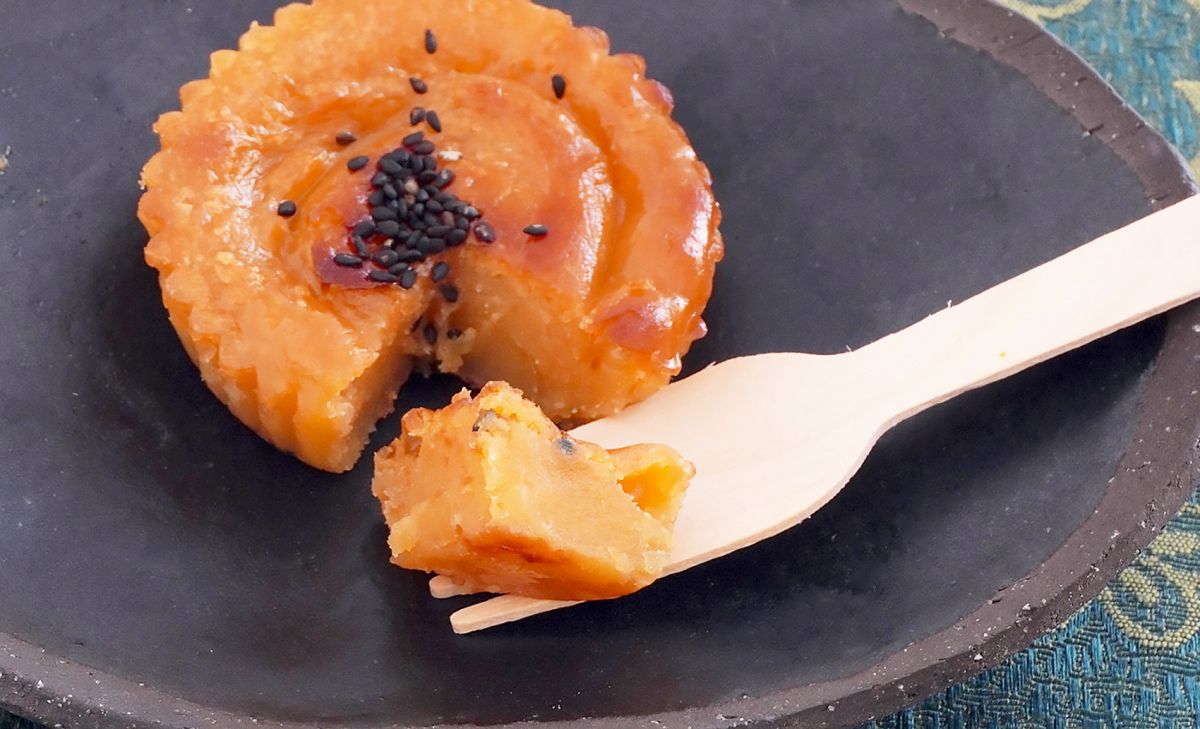 まあるく焼き上げられたスイートポテトは、ツヤツヤの黄金色。中央に黒ごまがトッピングされています。