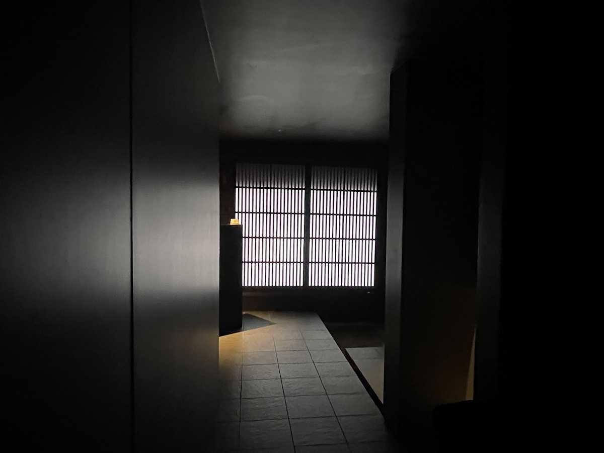 白いのれんをくぐり引き戸を開けると、繁華街の喧騒から引き離されて、別世界に入り込んだよう。思いがけない暗さにひきこまれそうな感覚になります。まずここで、受付をします。