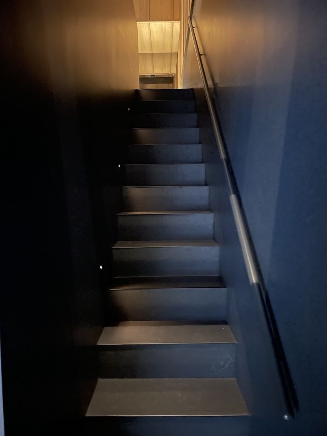 飲食スペースは2階です。足元に気をつけて薄暗い階段を上がると、少し明るさが。どんな空間が広がっているのか、わくわくします。
