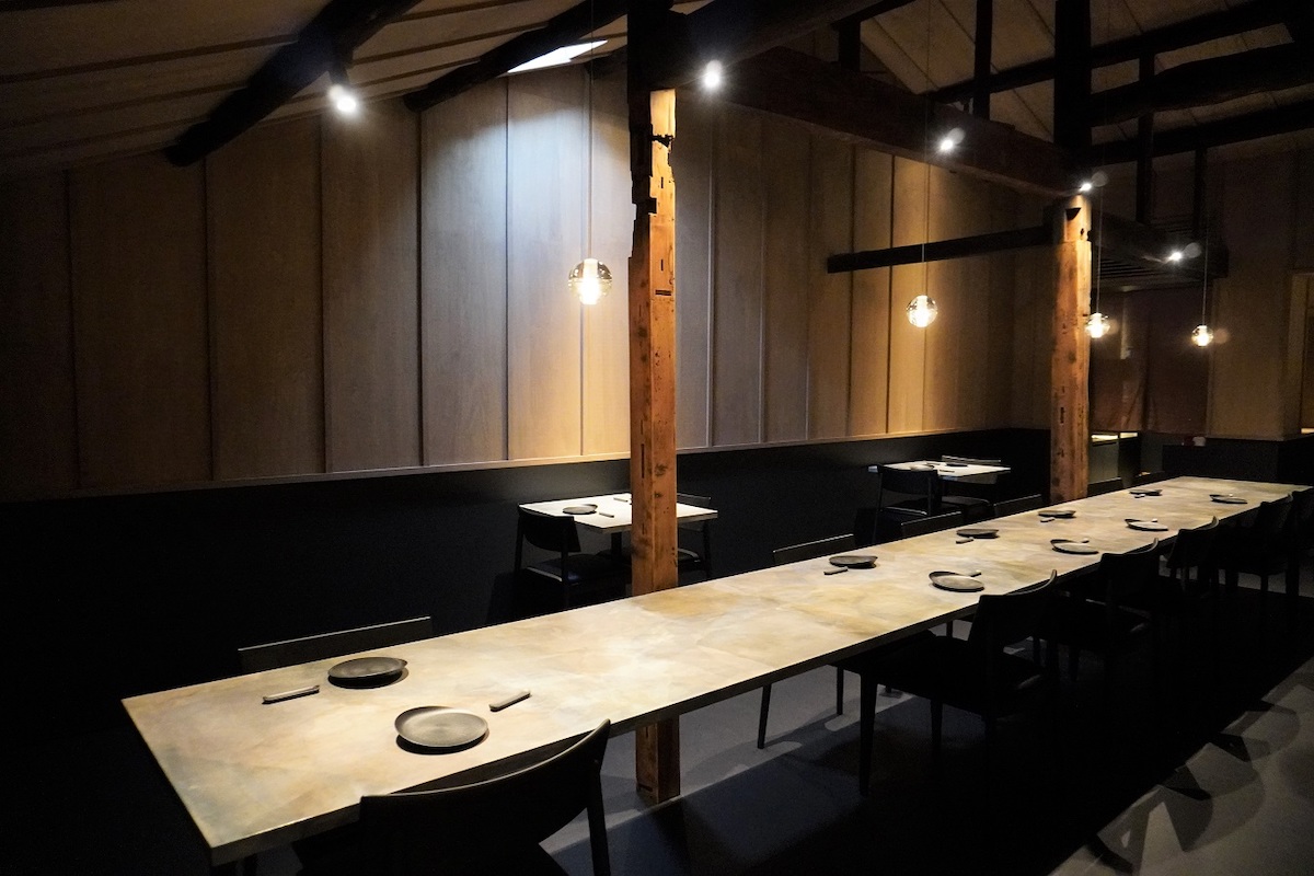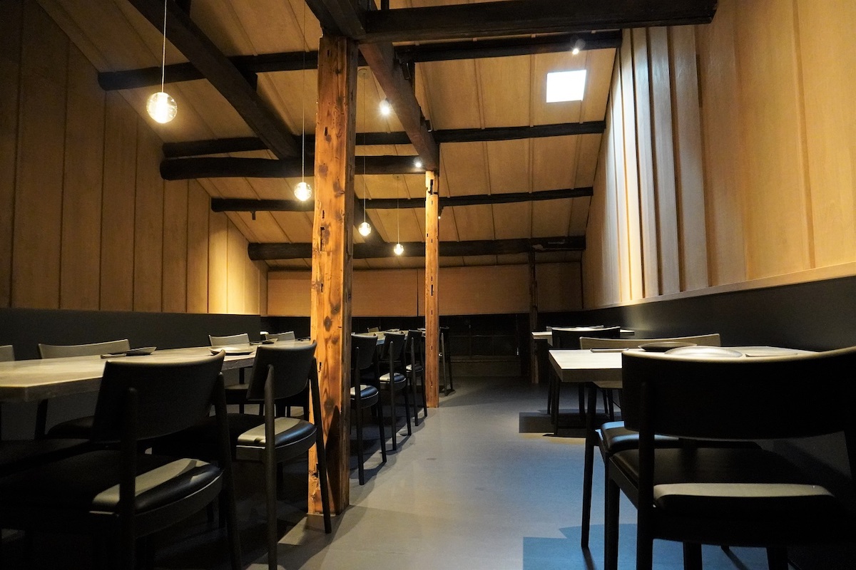 京町家の歴史と趣が感じられる、黒光りする太い梁と柱。木のぬくもりと、抑えた照明に包まれると落ち着きます。