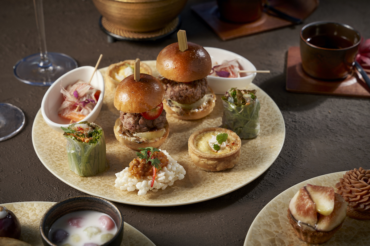下段には5種のセイヴォリー。「蟹と銀杏のタルト」や燻製キノコソースで仕上げた「ミニビーフバーガー」など、秋を感じさせるメニューに加えて、「タイの生春巻き」や「ライスクラッカー」といったタイの味も楽しめます。