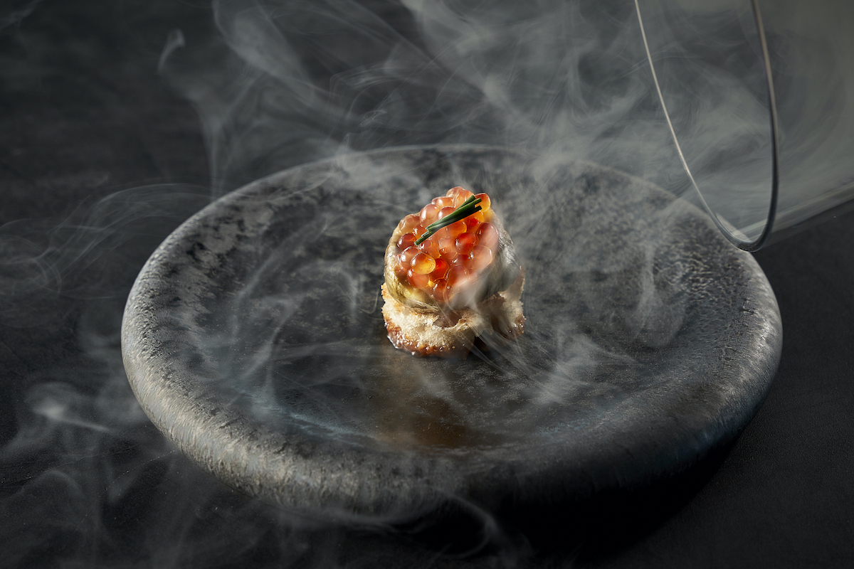 前菜に登場する「燻香を付けた自家製いくらと秋茄子 焦がしバターとトマトのソースを浸したトースト」は、秋鮭漁がピークのこの時期に、旬を迎えるいくらに燻香をつけ秋茄子にトッピングした一品です。