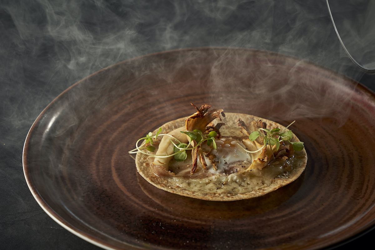 同じく前菜の「そば粉のガレット 舞茸の炙りとクリスピーポークベリー」は、炙った舞茸とクリスピーポークベリーをのせています。