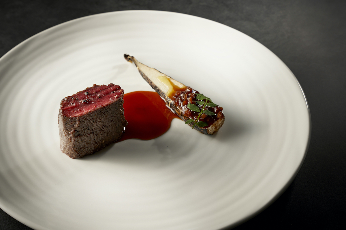 メインの肉料理は、人気のジビエ「鹿ロースのグリル マコモ茸の炭火焼き 山椒香る鹿のソース」。奈良・吉野や宮崎が産地の良質な鹿肉を炭火で炙り、しっかりと燻製の香りをつけています。マコモ茸の炭火焼と山椒の香る鹿のソースとともに、芳醇な香りと旨みが堪能できます。