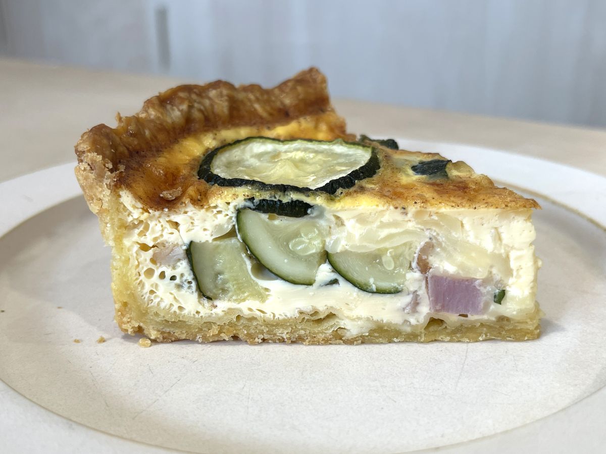 大きな輪切りのズッキーニが印象的な「ズッキーニとベーコンのキッシュ」は、ズッキーニのみずみずしさがたまらないキッシュ。ベーコンのしょっぱさとアパレイユのやさしい甘さがズッキーニの風味を引き立ててくれます。