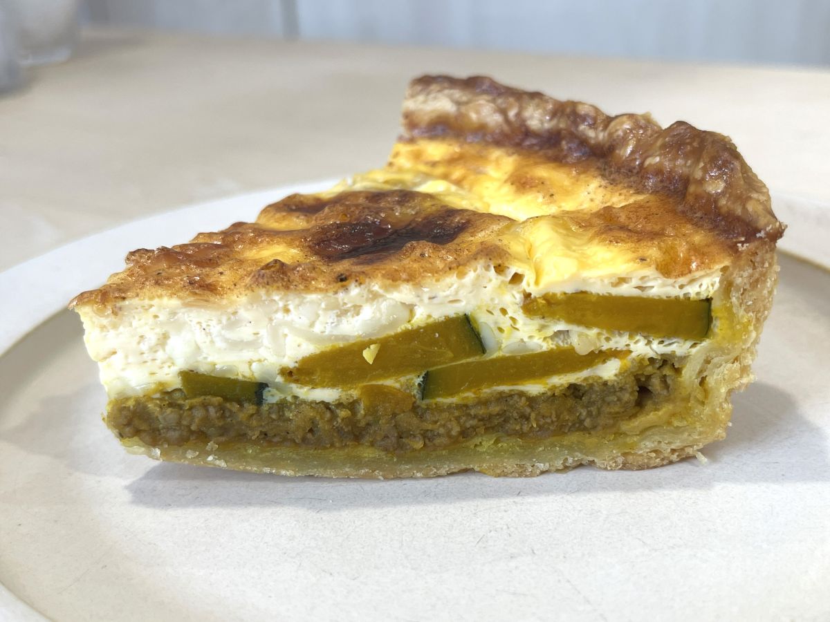 中には角切りのズッキーニがたっぷり。頬張ればゴロゴロ食感も楽しめます。苦みもないので、ズッキーニがあまり得意でない人でもおいしく食べられるキッシュです。