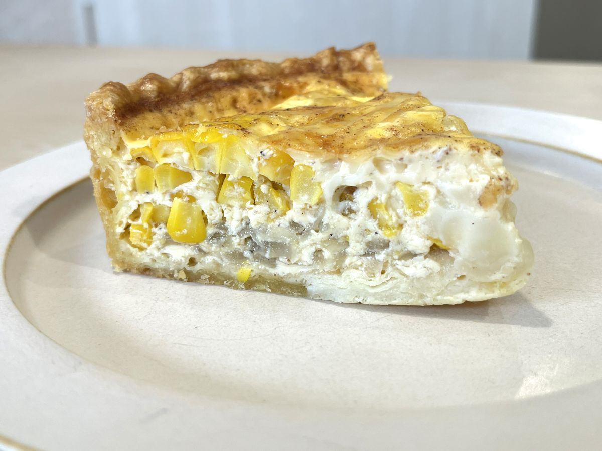 今回ご紹介するキッシュの中でいちばん食感が楽しいのが「とうもろこしと玉ねぎのキッシュ」。とうもろこしのプチプチ食感と玉ねぎのシャキシャキ食感が合わさって、噛