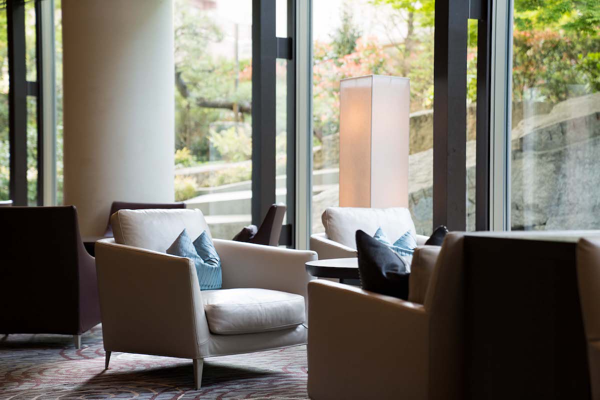 ラウンジ内も、光あふれる吹き抜けや、水面をイメージしたじゅうたん、特注の柔らかなソファなど、細部にまでこだわりが感じられます。高級感ある洋風の空間と緑豊かな和の庭園の融合が特別な落ち着きを演出してくれますよ!