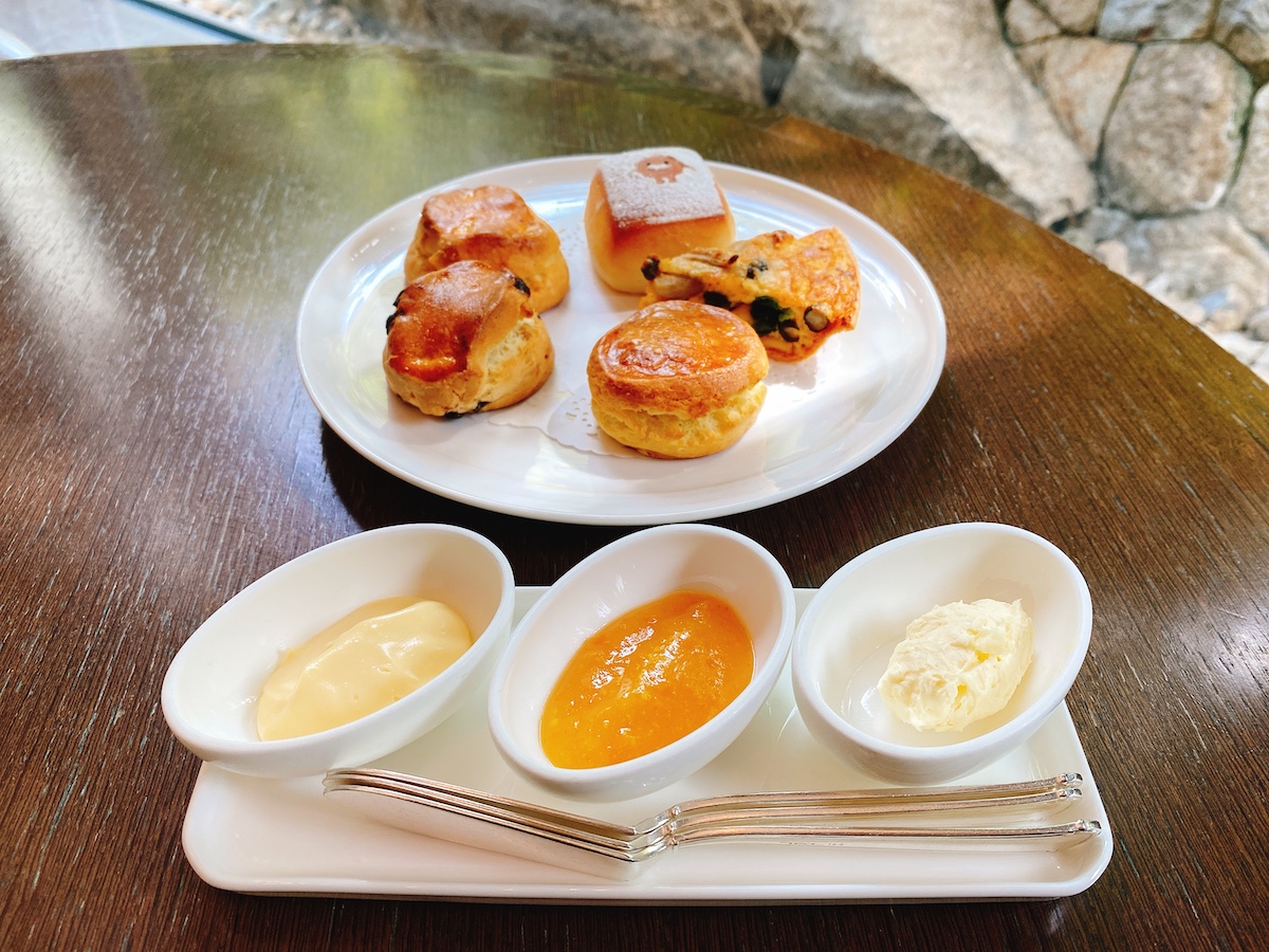 中段には3種のスコーンとキッシュ、ミルクパンが並びます。栗を使ったほのかな甘みが特徴の「栗のスコーン」やクルミとチョコレートを使った楽しい食感と甘さが幸せを誘う「胡桃とチョコレートのスコーン」は特に注目です。レモンカスタード、ママレード、クローテッドクリームの3種のスプレッドもセットになっているのでお好みでスコーンやパンに付けて。