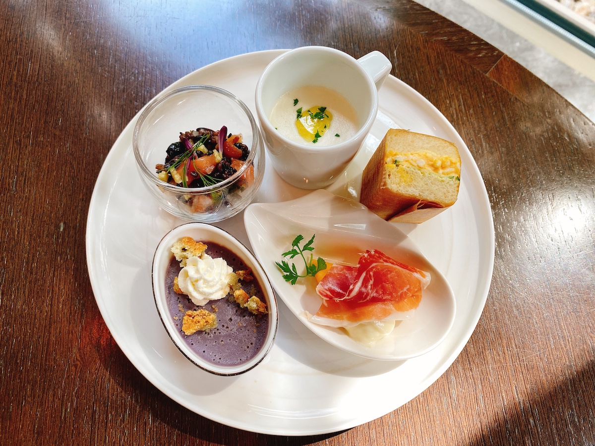下段には、ライスサラダやフランスの国民的お菓子であるフラン、口あたりなめらかなブルーテ、サンドッチなどが揃っています。なかでも推したいのが「柿と生ハム マスカルポーネクリーム」。秋を代表する果物である柿の甘みと生ハムの塩味が相性抜群です。