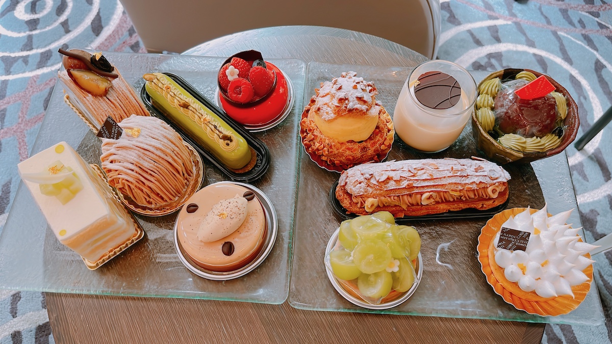 10〜11月は、秋の味覚を感じられるアフタヌーンティーを提供。上段は乙女心がときめくようなビジュアルのデザート6種!季節の素材であるイチジクやサツマイモ、栗を使ったタルトやプリン、モンブランは秋の訪れを存分に感じさせてくれます。