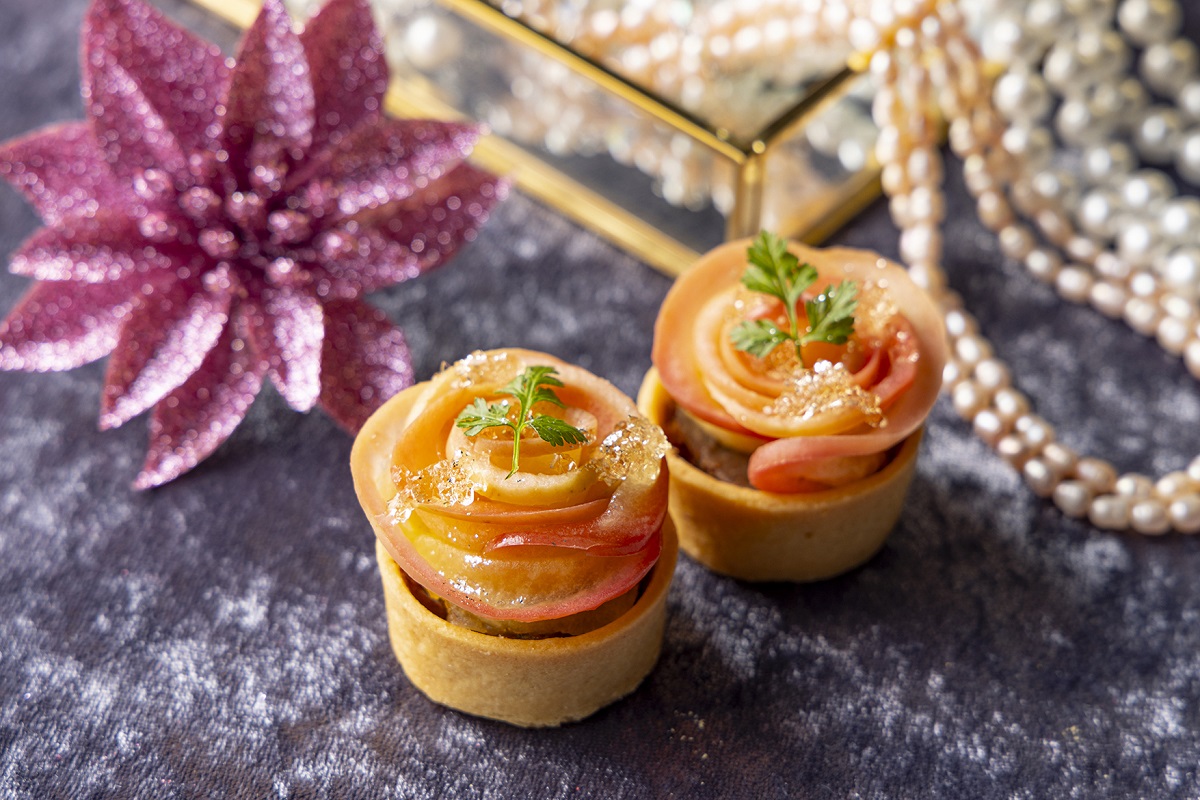 セイボリーは、ジューシーなダックコンフィと、ボルドー地方で造られる貴腐ワイン、ソーテルヌが香るバラをモチーフにした「ダックコンフィ ソーテルヌ香るりんごのロザス」、酒粕をアクセントに加えた「塩麴でマリネした鶏肉と酒粕のマッシュポテトタルト」などを楽しむことができます。