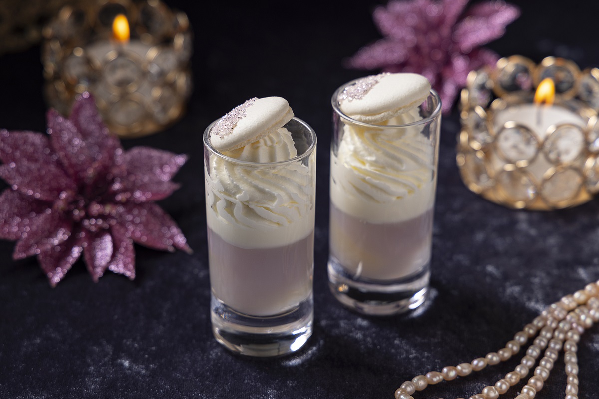 ラベンダーカラーを基調とした2層のヴェリーニ。りんごの果肉が入ったラベンダーのゼリーにバニラのパンナコッタを重ねて仕上げられています。トップにはホイップクリームと、プレーンマカロンを添えています。