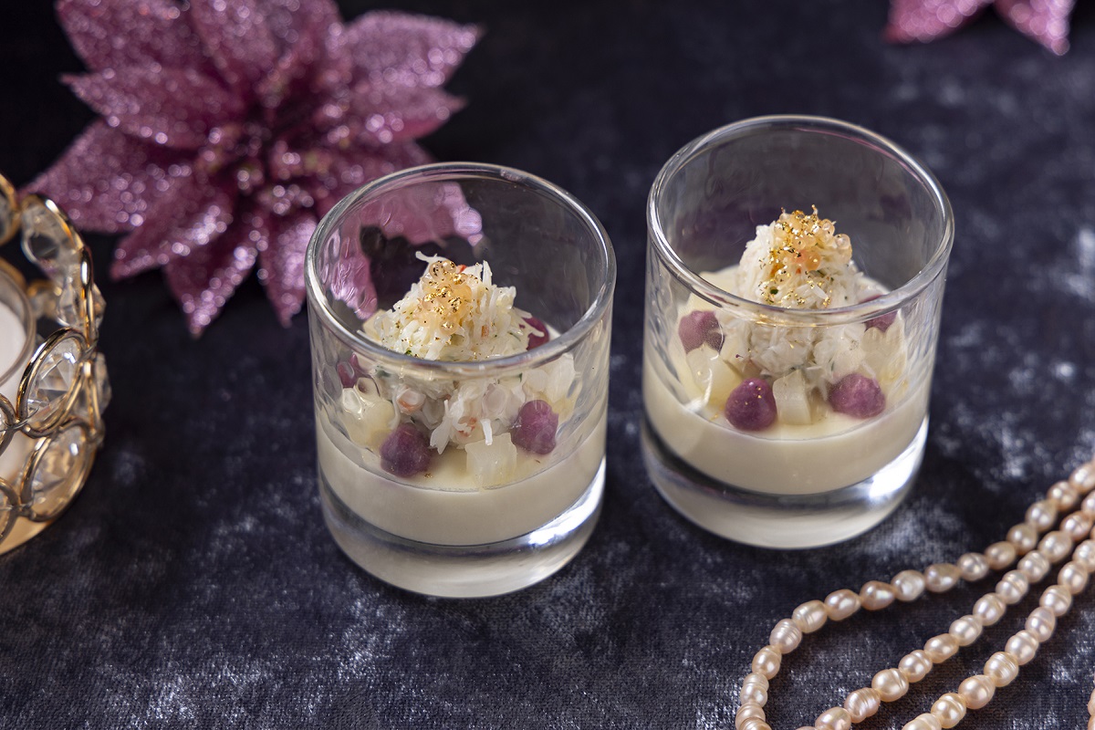 ズワイ蟹と百合根のパンナコッタの上に蟹身とキャビアライムをトッピングし、さっぱりとした味わいに。周りはセロリのピクルスと、蟹みそのクリームでクリスマスらしい色合いに仕上がっています。