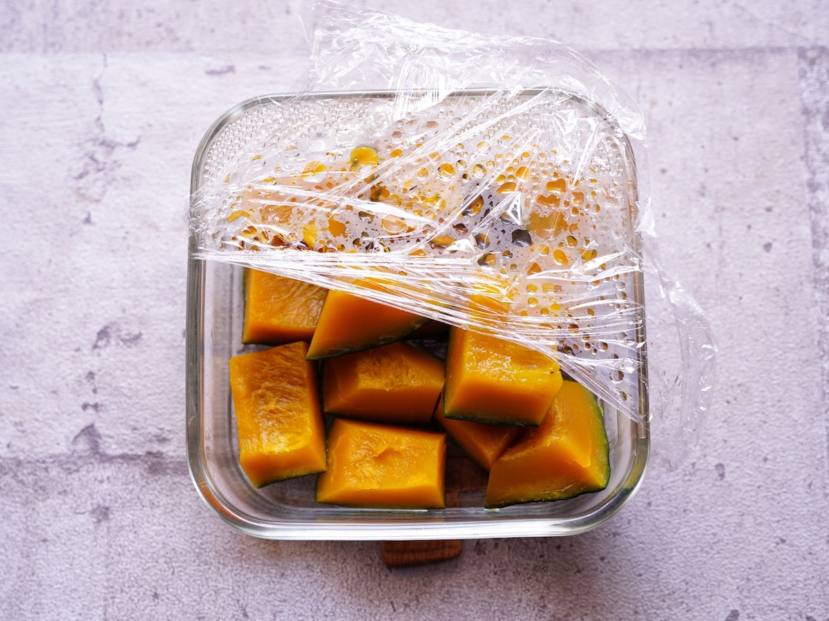かぼちゃは種を取って、適当な大きさに切り分け、耐熱容器に入れて、水大さじ1(分量外)を回しかけ、ラップをして、竹串がすっと通るまで、レンジで加熱します。(600wで4~5分ほど)