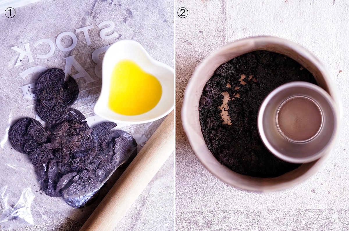 ①クリームを取り除いたオレオを袋に入れて、麺棒で細かくします。途中、溶かしバターを加えてよく混ぜて。