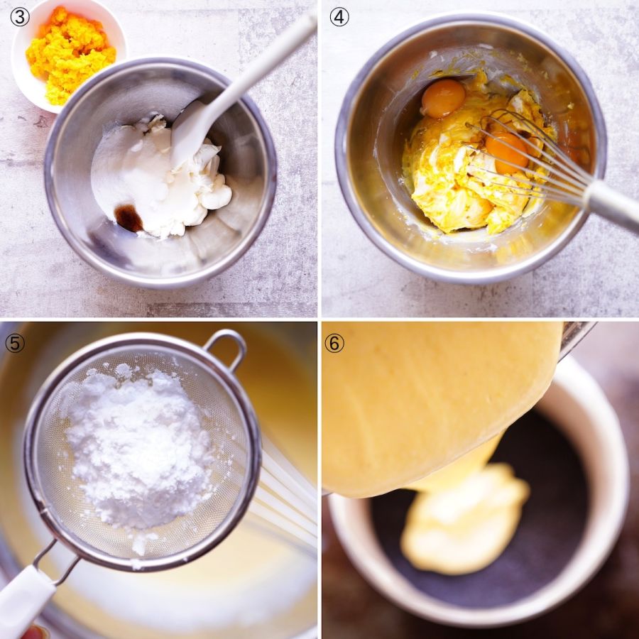 ④かぼちゃペーストを加えて混ぜ、卵黄2個分と、別に量った卵白を加えて、さらによく混ぜます。