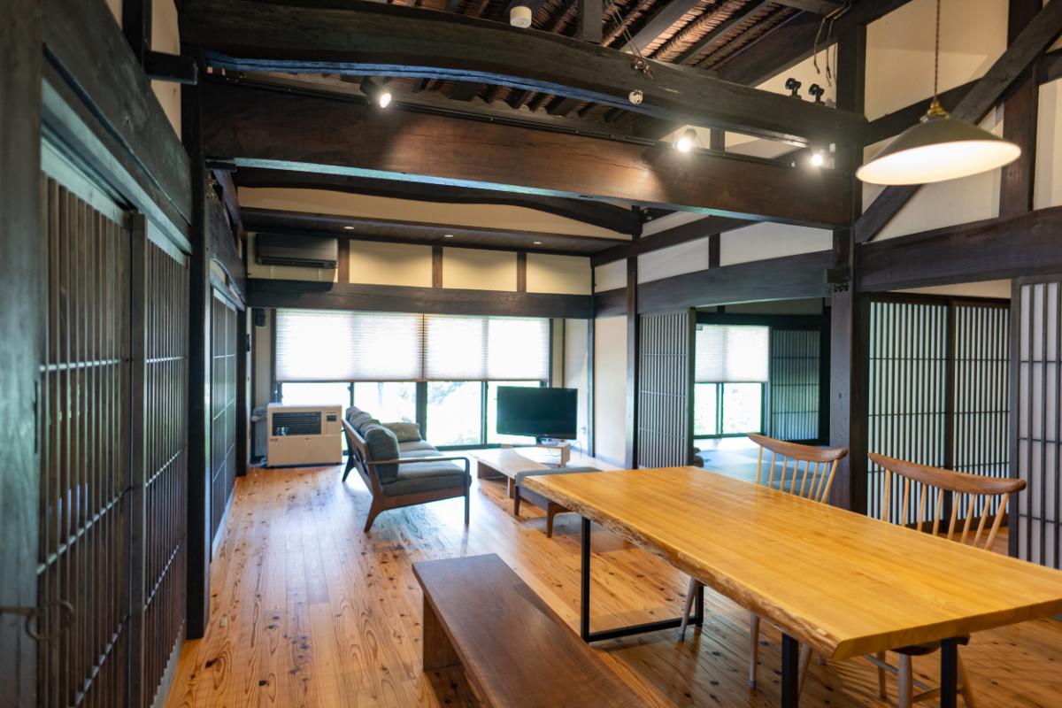 築150年を超える古民家をリフォームした内装は、和モダンで洗練された空間が印象的。日本家屋の木組みのよさが随所に生かされています。元々あった天井を取り払ったという部屋は、開放感があり、茅葺き屋根や立派な梁を眺めることができます。