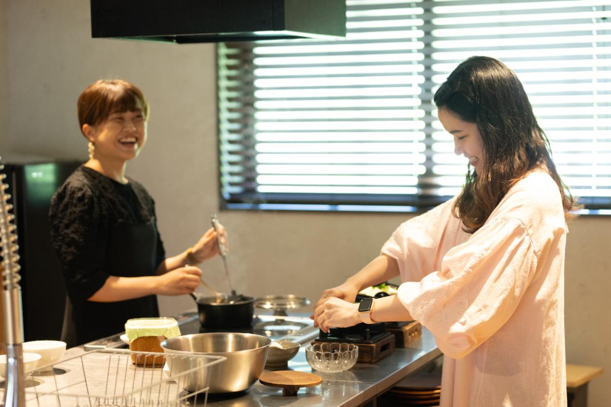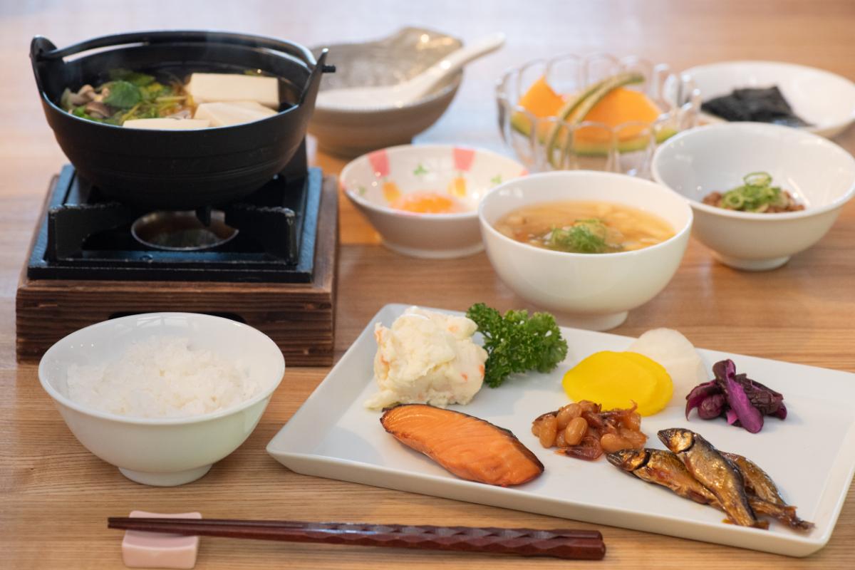 朝食は自炊。地元産の米と味噌を使って作ります。予約をしておくと、下ごしらえされた食材が届けられるので、初心者も安心。IHヒーターや魚焼きグリルが完備されたアイランドキッチンは、調理台も広々と使えるので快適です。自分たちで好きな食材を持ち寄り、好きな料理を楽しむこともできます。朝食セットは、ごはん、味噌汁、納豆、焼魚、漬物のほか、温泉卵に湯豆腐と盛りだくさん(※季節により変動あり)。甲津原で育った甘くておいしい米とともに、地元の大豆を使い、「甲津原漬物加工部」で作られる味噌のやさしい味わいを味噌汁で楽しみましょう。