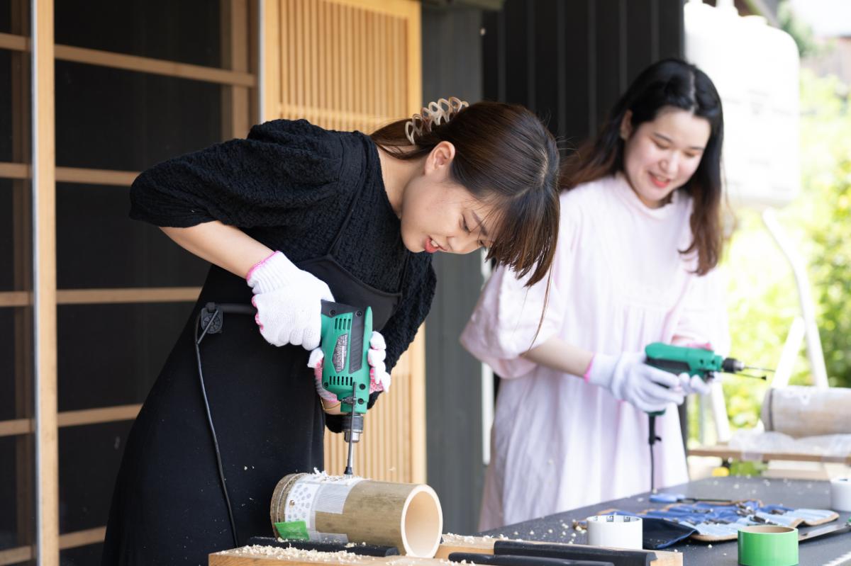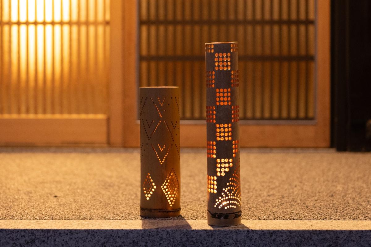 「そよも」では、宿泊者限定でランタン作り体験を行っています(3000円、約1時間)。作り方は、自然の竹を切り、印が描かれた型紙に沿って、電動ドリルで穴を開けていくだけ。印の中に書かれた番号に合わせて、ドライバーのサイズを変えていくので、ひとりでも作業ができます。型紙のデザインは、花火のような細かい模様から、星やハートなど、チャレンジしやすいものまで種類豊富。好きな図柄を組み合わせて作るランタンは、大切な人へのおみやげにぴったり。作ったランタンは、ロウソクやLEDライトを使ってライトアップもできます♪