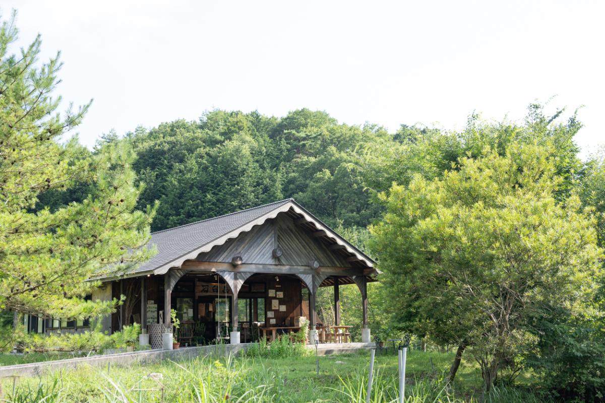 琵琶湖へと注ぐ一級河川・姉川の源流域に、曲谷(まがたに)とよばれる集落があります。そこへ移住した夫婦が営むカフェレストラン「MAGATANIA」があるのは、姉川ダムを望む森の中。山に囲まれた草原に立つ山小屋風カフェの非日常的なロケーションは、訪れる人々の印象に深く残ります。