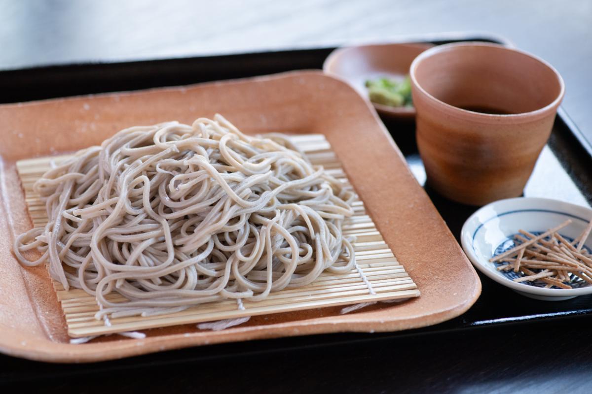 伊吹山周辺の山村地域で、1000年ほど前から栽培されてきた在来種のそば「伊吹そば」。そばの実の直径が4.5㎜以下と小さく、甘みがあるのが特徴。文献によると、江戸時代には全国で知られるほど有名で、彦根藩主へ献上品として「伊吹そば」が納められていたという記録も残されています。「麺工房 伊吹長兵衛」では、「伊吹そば」の本来の味をダイレクトに味わうことができるよう、小麦や塩などを使用せず、そば粉と水だけで練った手打ち十割そばがいただけます。