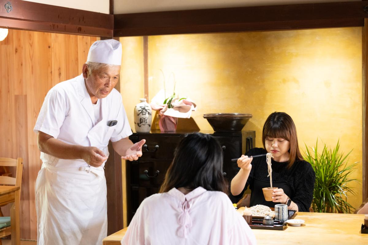 この店は、「伊吹そば」の取扱店を中心に結成された「伊吹そばの会」の会長、膽吹(いぶき)邦一さんが営む伊吹そば専門店。地域に根付く「伊吹そば」を伝統の味として継承し、再び全国ブランドへと成長することを願い、そばの生産拡大や、販売拠点の開拓などに精力的に取り組んでいます。「伊吹そば」は、生産地の特徴と伝統が結び付いた特産品を、知的財産として国が保護する「地理的表示(GI)」に登録されていて、「さらなる地域の発展に貢献していきたい」と膽吹さんは語ります。長年の研究を重ねて作り上げた、上質で香ばしく、のど越し抜群の「伊吹そば」を堪能しに出かけましょう。