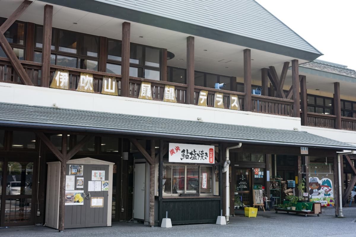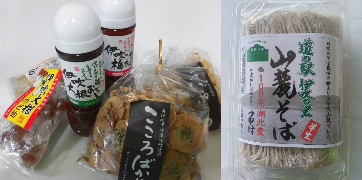 おみやげに人気の商品は、地元の食材を利用した品々。伊吹大根を利用したのど飴「伊吹の梅干し飴」324円、「伊吹大根ドレッシング」「伊吹の梅たっぷりドレッシング」各550円、地元の味噌を使用したせんべい「心ばかり」330円、地元の大豆・黒豆を使用した豆菓子「一寸いっぷく」400円、「道の駅 伊吹の里 山麓蕎麦」810円など、さまざまなアイテムが揃っています。