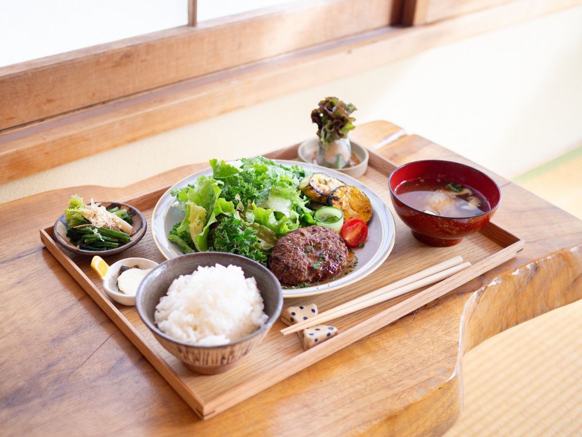 ランチの定食は、お肉、お魚、または合盛りの3種類から選べます。こちらは「お肉の定食」1080円。メニューは日替わりですが、この日はハンバーグでした。食事はすべて手作りだそうで、ほっこり落ち着く空間でいただく手作りの優しいご飯に、お腹も心も満たされました。栄養バランスのとれたメニューなのもうれしい!