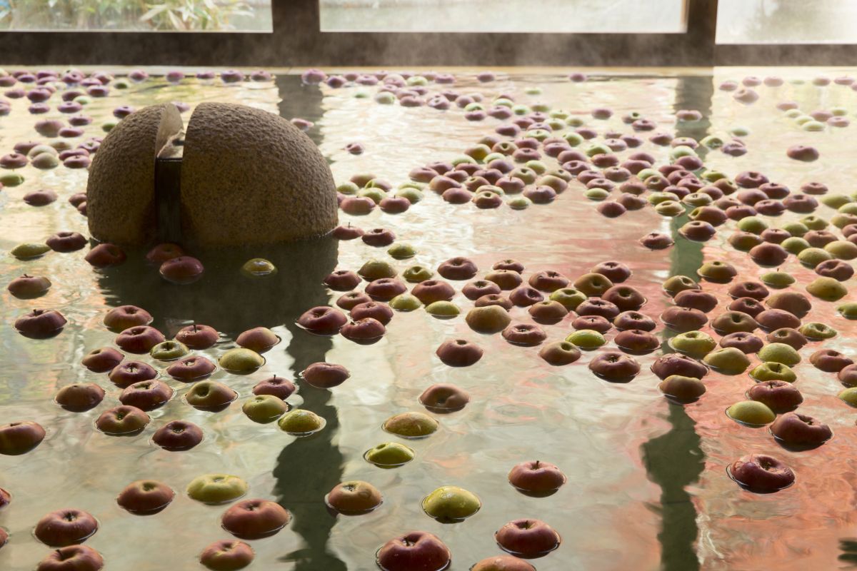 開放的な露天風呂はもちろん、大きな窓のある内湯からも周辺の自然を眺められるトンボの湯。「りんご湯」の時期はちょうど紅葉シーズン。さわやかなりんごの香りに包まれながら温泉と紅葉を満喫!と、なんともぜいたくな体験ができるイベントなのです。