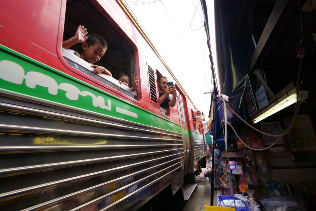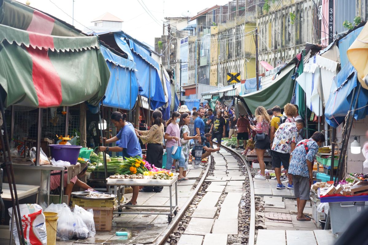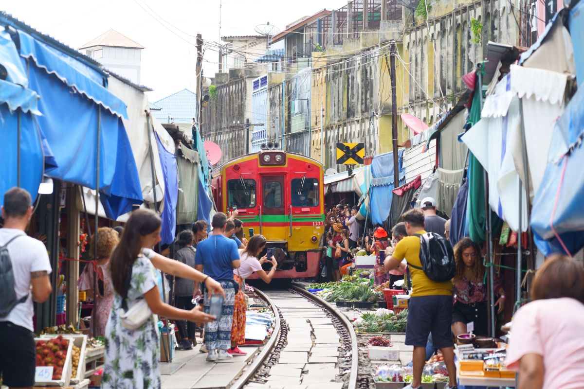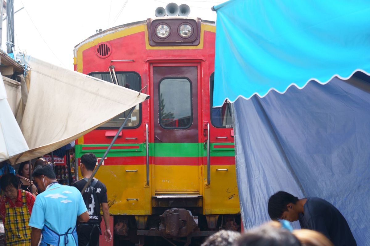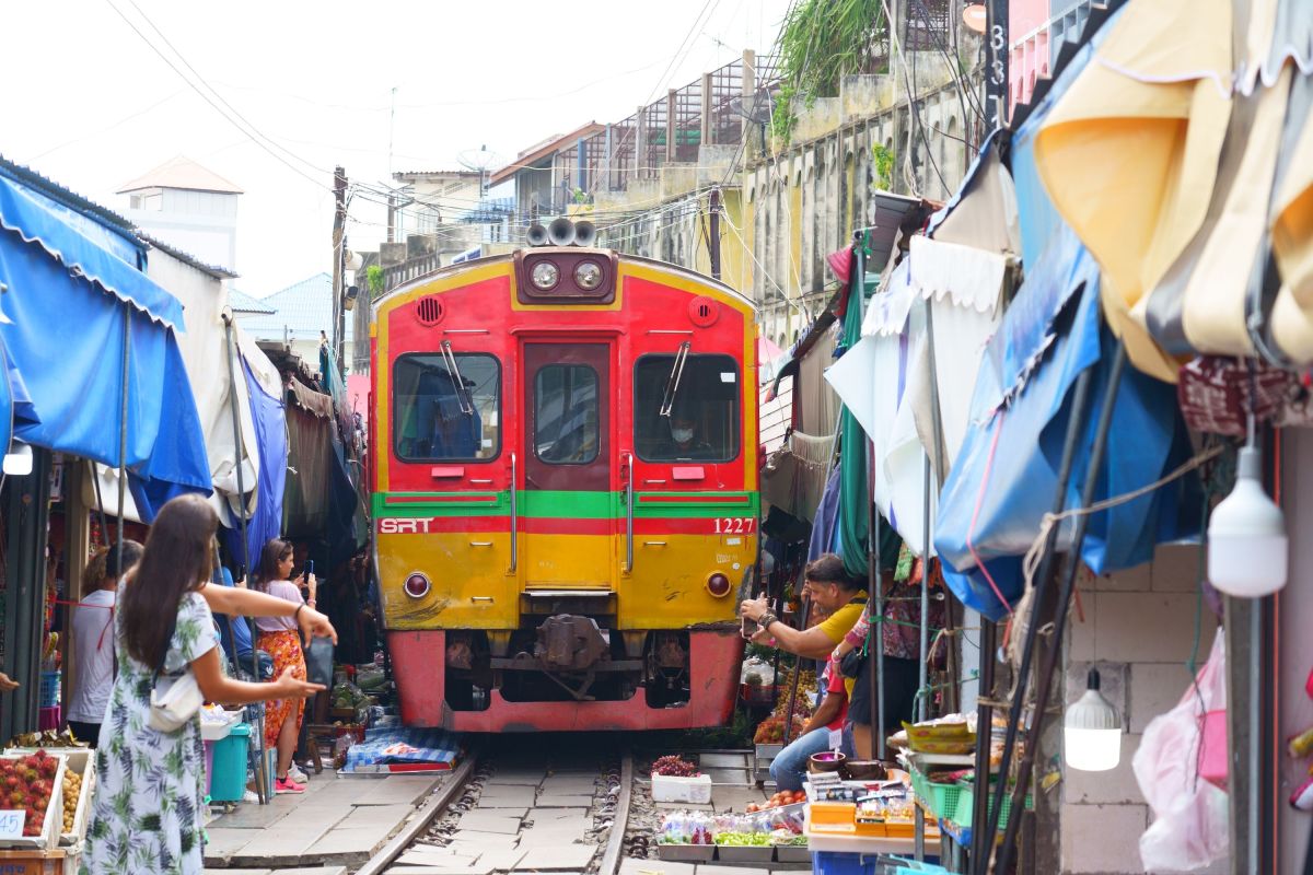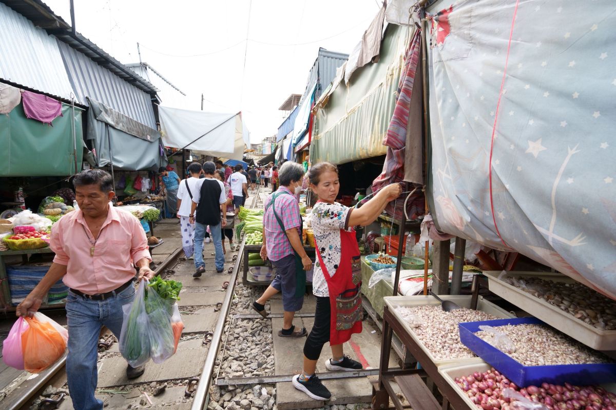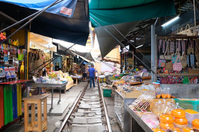 目の前すれすれを電車が通り抜ける!「メークロン市場」