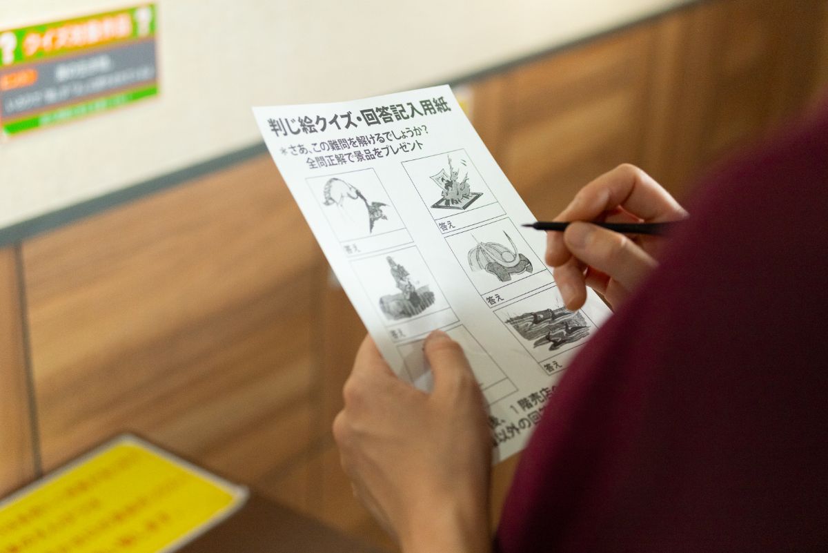 展示室内に置かれた紙とペンは、誰でも参加可能な「判じ絵クイズ」用。回答用紙を1階のショップコーナーに持って行くと、全問正解の場合はオリジナルグッズをもらうことができます。