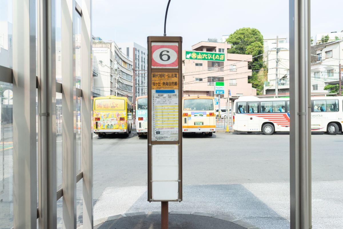 電車を利用する場合、JR熱海駅にあるバス停の6番乗り場から東海バスに乗車。網代旭町・桜ヶ丘・熱海自然郷方面のバスに乗り、約11分で到着です。名勝地である「錦ヶ浦」バス停で下車し、潮風を感じながら約10分ほど坂を上ります。