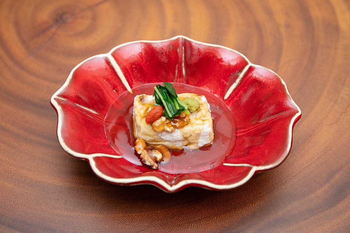 精進料理は、丁寧につくられた焼牛蒡豆腐の先付に始まり、お椀は木津川市産茸(きのこ)を使用したやさしい味わいの木の子すり流し。