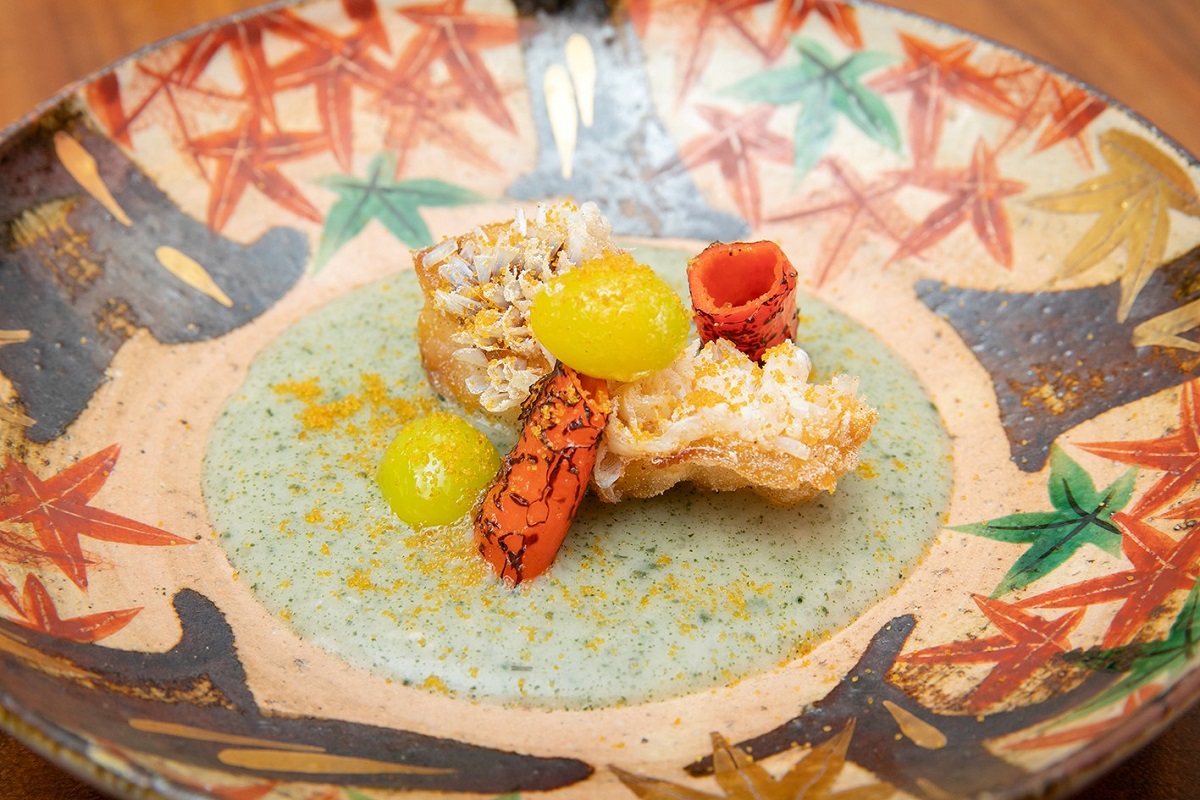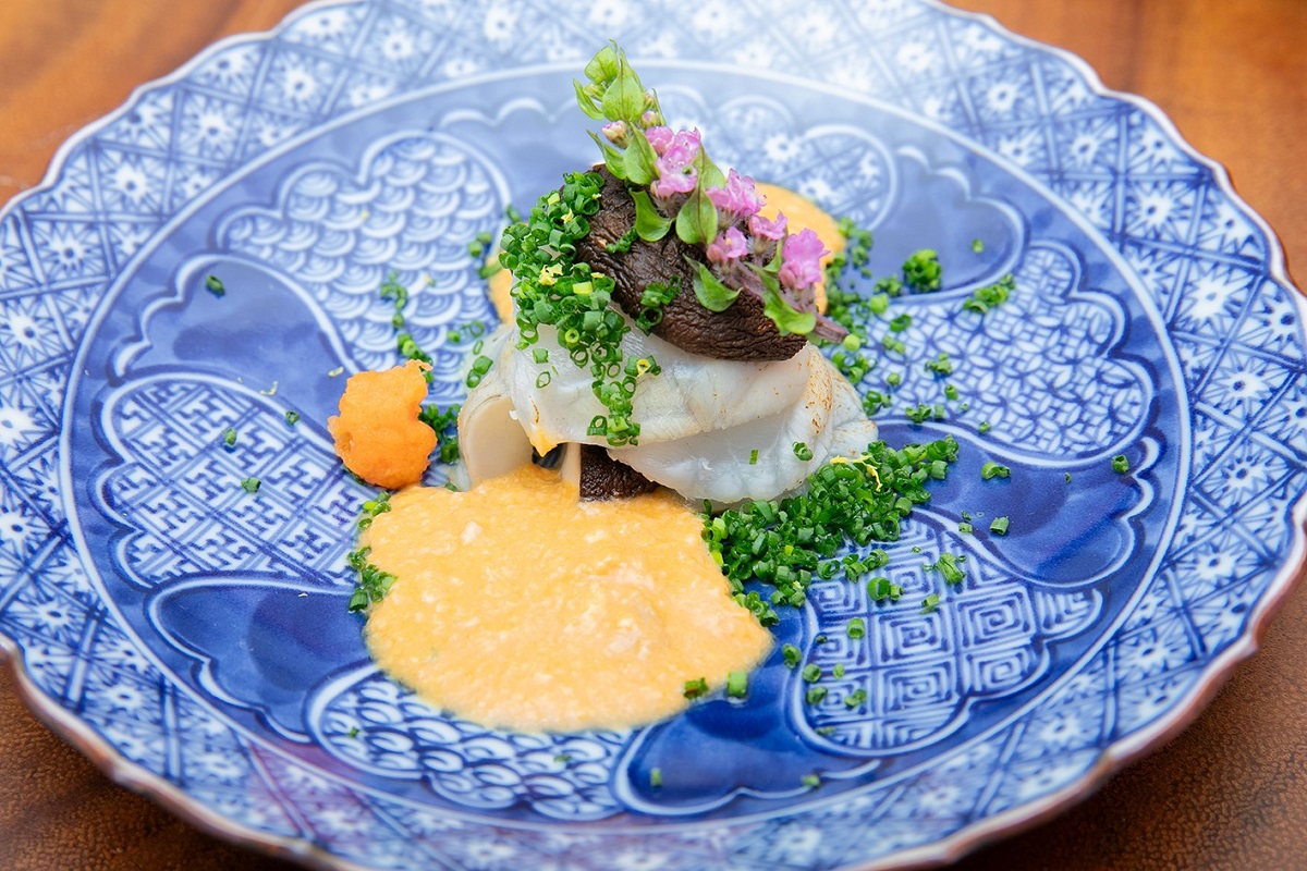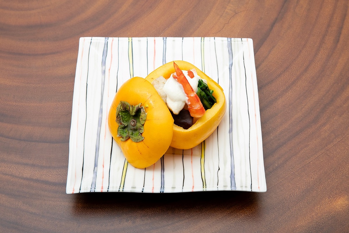 繊細に作り込まれた美しい盛込みは、自然薯磯辺揚げや、朴葉焼き(海老芋、揚湯葉、椎茸等)、ずいき葛煮など、木津川市の恵みを感じられる品々が並びます。煮物には、ほっとする味わいの蕪煮物を。