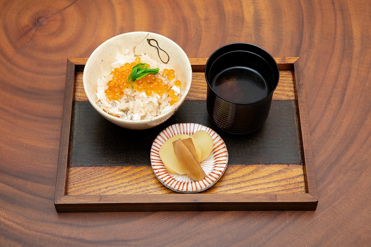 食事は、いくらと三つ葉をのせた焼河豚ほぐし蟹炊込ご飯に、赤出汁と香物です。