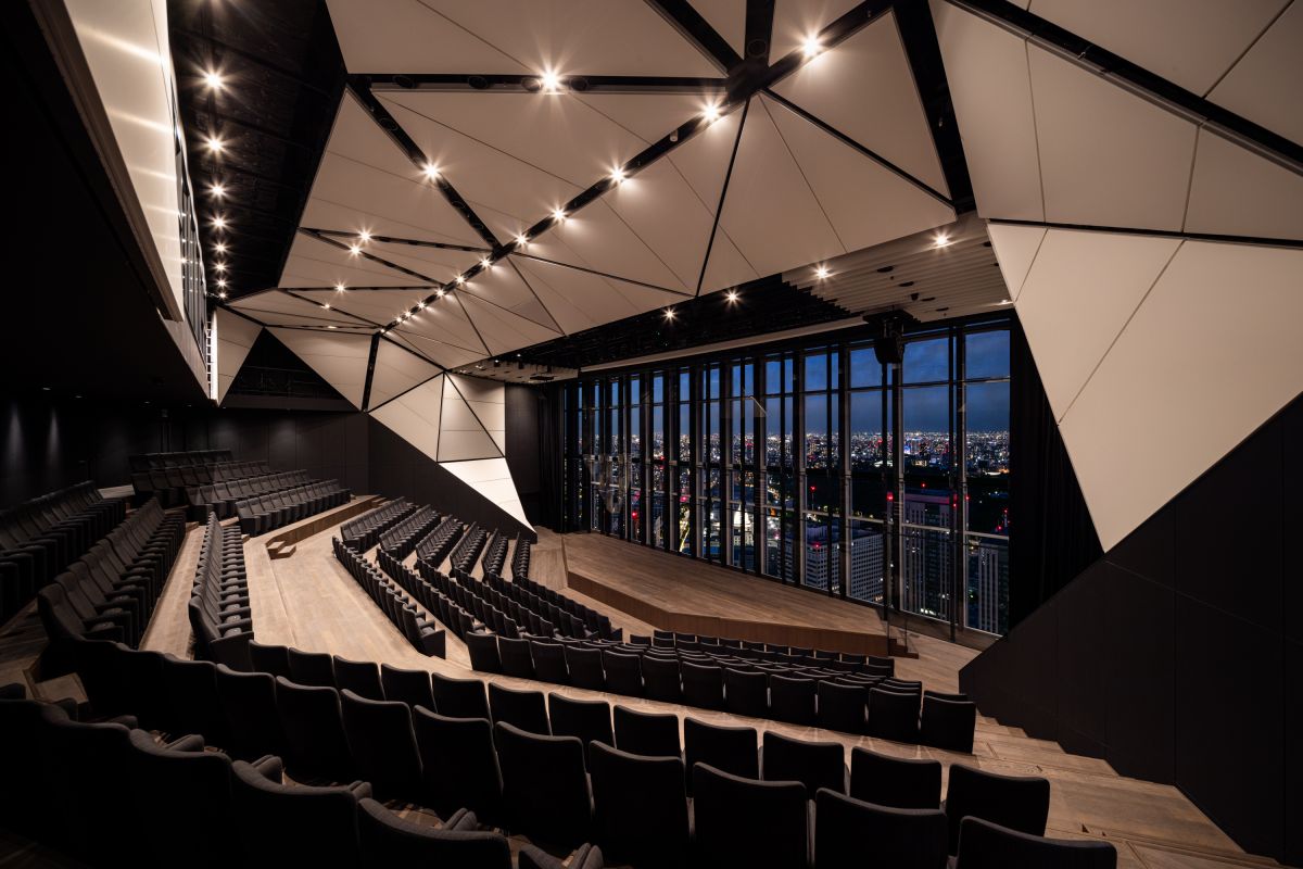 「TOKYO NODE」の象徴的な施設となるのが、客席数338席、全面スクリーンや防音構造を備えるメインホール「TOKYO NODE HALL」。46階と47階部分に位置し、東京の景色を背景に、音楽ライブやビジネスのプレゼンテーション、パーティーなど幅広いイベントが開催される予定です。