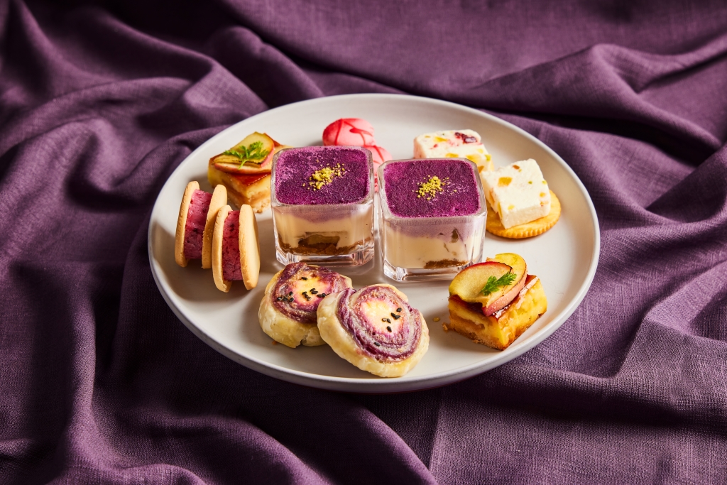 紫いもティラミス/りんごのシブースト/ラズベリーマカロン/ブルーベリーバターサンド/紫いもクリームチーズパイ/ドライフルーツのカッサータ