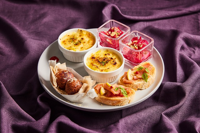 かぼちゃグラタン/生ハムとレモンのブルスケッタ/紫いもチーズボール/りんごと赤キャベツのマリネ