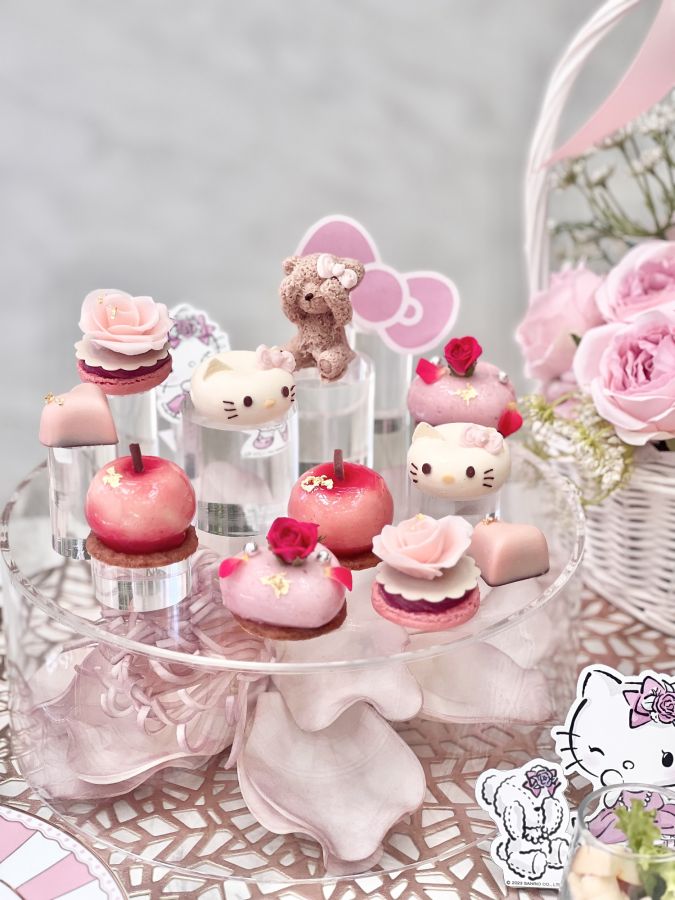 Ginger Garden AOYAMAにて、2023年12月10日(日)までの期間限定で販売されているのが「ハローキティ コラボアフタヌーンティー」。ピンクローズガーデンをイメージした店内で、ベビーピンクを基調としたスイーツやセイボリーが宝石のように並びます。